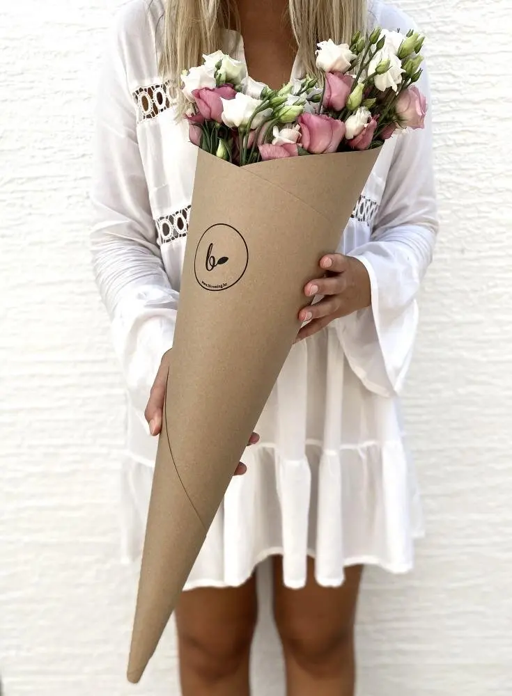 Sodoben cvetlični aranžma svežih liziantusov v rjavem stožcu.